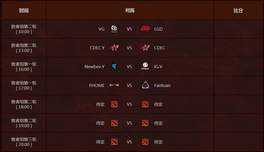 辉夜杯主赛事首日进行了胜者组第一轮的4场比赛,最终VG、LGD、CDEC.Y和CDEC晋级胜者组第二轮,而NewBee.Y、iG.V、EHOME和FANTUAN则落入败者组。
