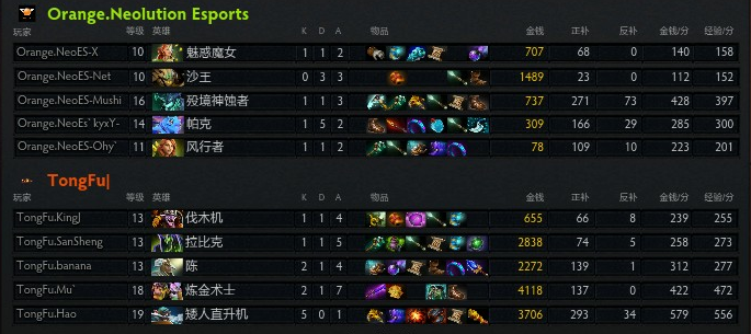 点评:Orange的执行力在这局很有问题,在线上优势的情况下,没有合理安排好带线和推进的节奏,被刷出狂战的敌法师和蓝猫牵着鼻子走,而sansheng在对手远古的眼也使得Orange在5分钟内暴露于对手的视野里,发育起来双切入后期在装备成型后收割能力惊人,Tongfu1:0领先。
