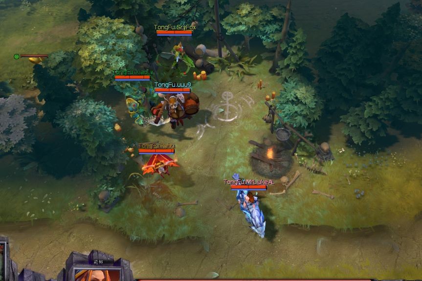 6分钟,骷髅王先手锤住猴子,火女白虎奋勇向前,但是还是被临死的猴子扔出技能,VIS没有选择秒杀火女反而针对骷髅王,双方大哥一换一,然后残血火女被杀,pom吃开一片树林残血逃走。