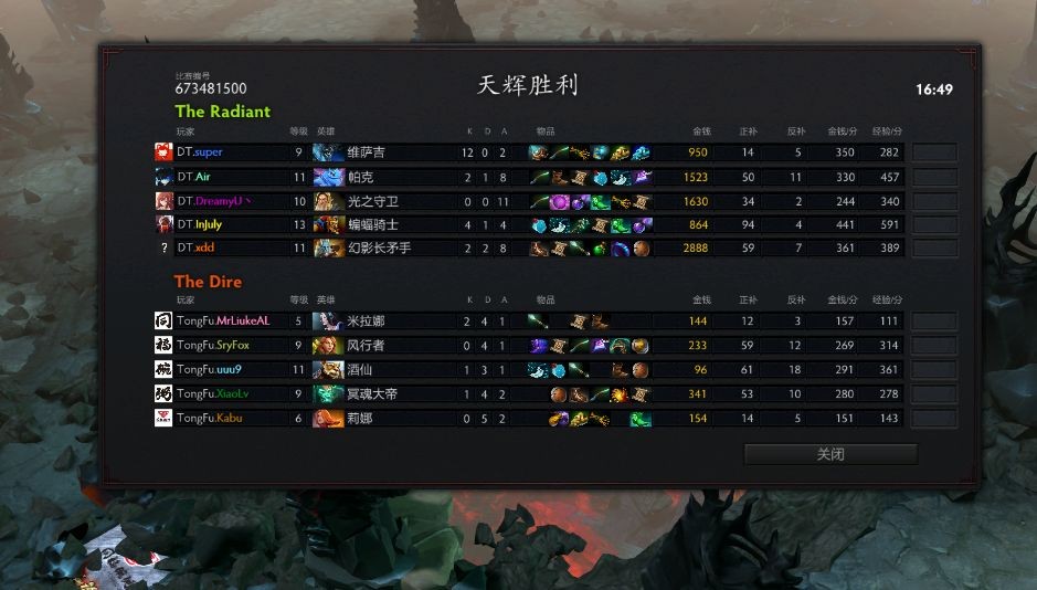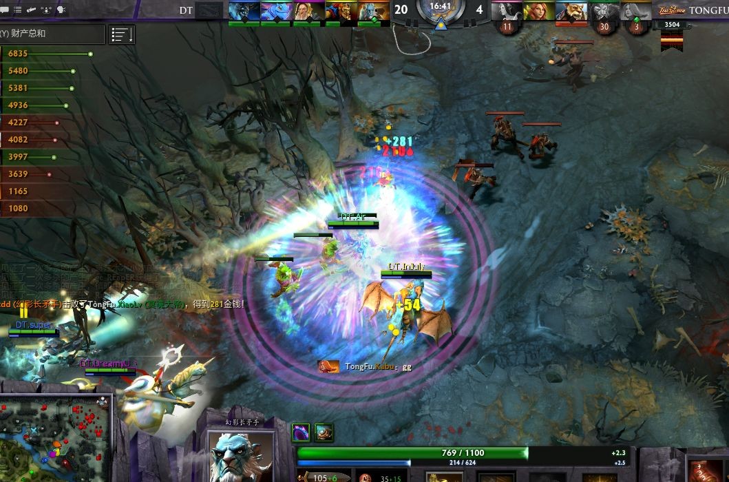 16分41秒,近卫技能全扔,puck跳大沉默,夜魇方阵亡三人,TongFu打出了GG