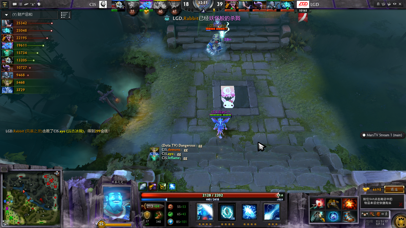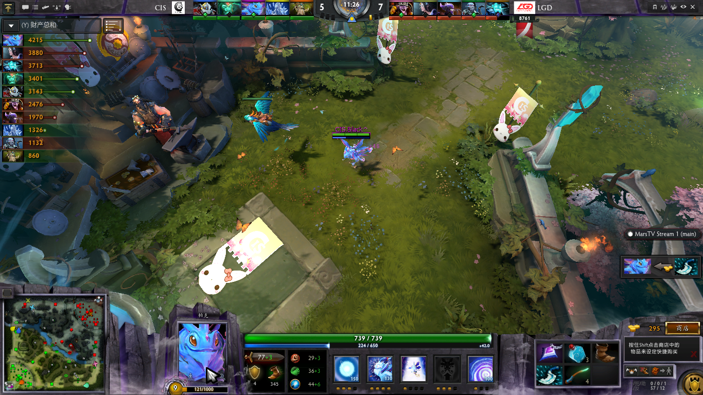 18分钟,LGD开雾抓骷髅失误的情况下吸引CIS全队来到中路抱团,老虎先手箭射中发条印发中路团战,但是CIS开打时已经减员,在小B神发挥神勇的情况下依然只打成3换2,并且发条买活,经济情况变差,CIS在局面上依然被动。