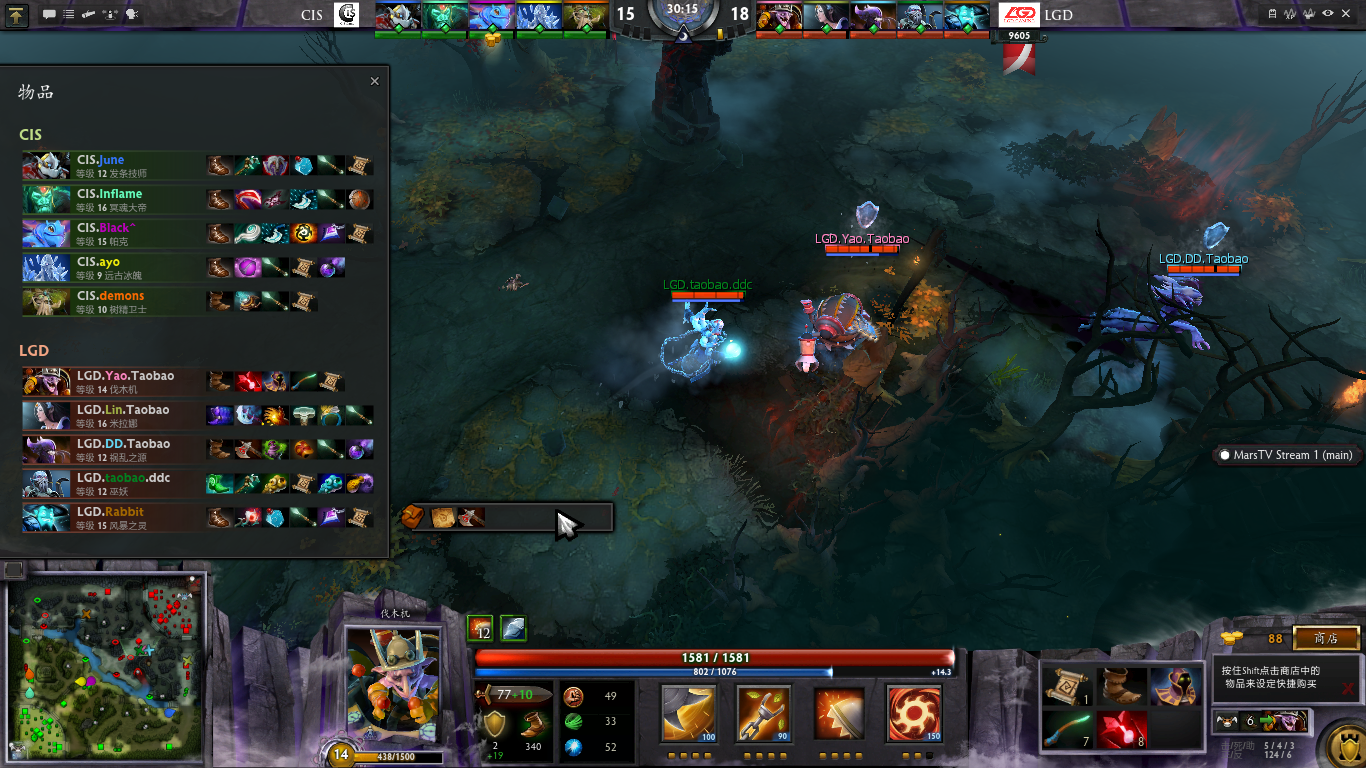 15分钟,CIS战队5人下路抱团企图推塔,但是伐木机清线能力很强无法撼动LGD外塔,而LGD战队只用了3个小弟和对方5人耗兵线,老虎和蓝猫一刻不停求发育。