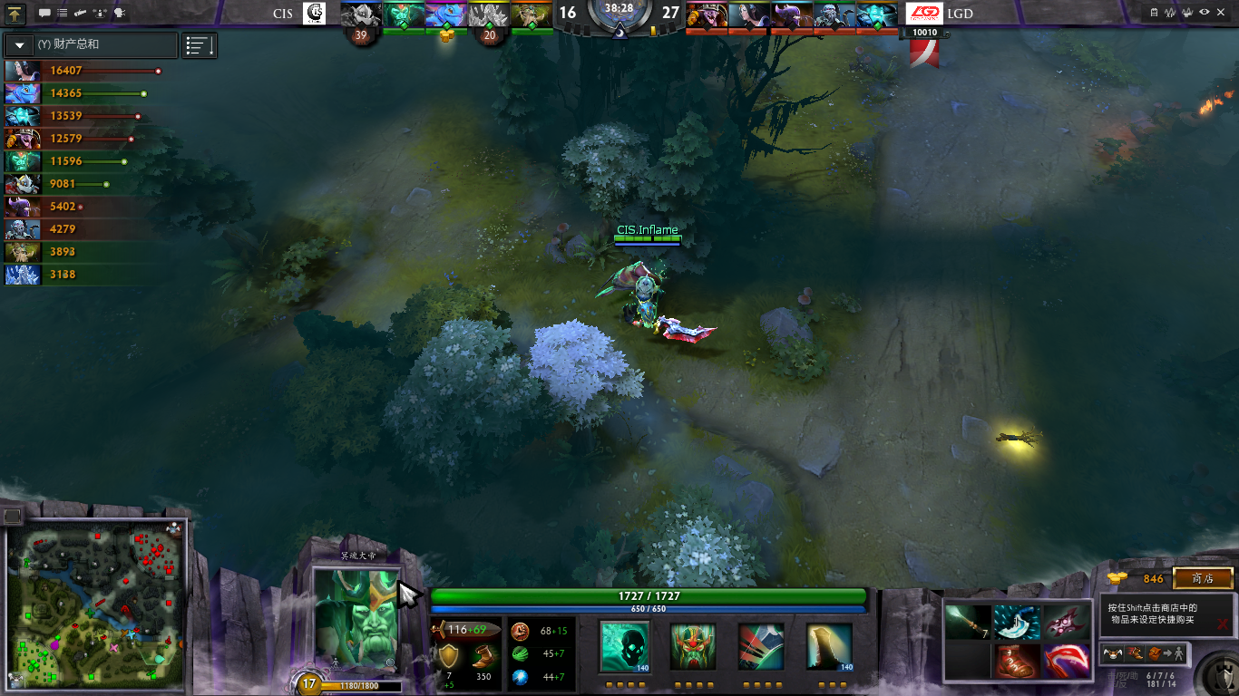 38分钟借助老虎大招,LGD在天辉野区发起一波小团战,杀掉CIS两人后扬长而去。CIS众人由于阵亡过多装备停止更新,此时团战显得有些力不从心。