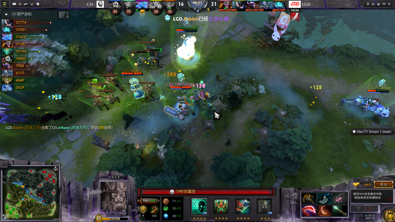 32分钟骷髅王偷肉山被LGD发现,打掉一条命只能仓皇而逃。此时骷髅王已经16级拥有3级大招,而蓝猫刚到手的BKB却浪费在击杀骷髅的第一条命上,此时蓝猫BKB冷却中,CIS似乎又迎来一波机会。