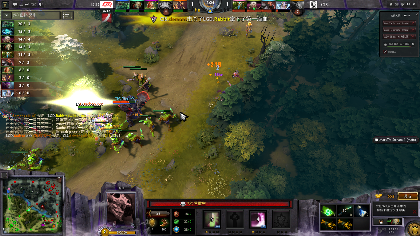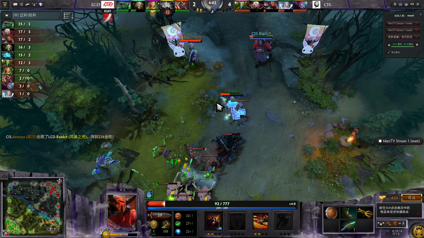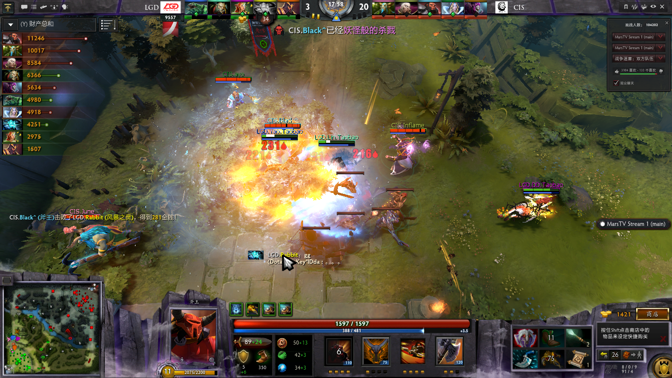 17分钟CIS已经开始消耗LGD上路高地,由于前几波吃了没蓝的亏,潮汐直接绕后让其他队员吃磁暴,结果潮汐绕后沉默开大,斧王神勇打开BKB吼住LGD三名主力并且直接三连斩,打得LGD直接敲出GG。