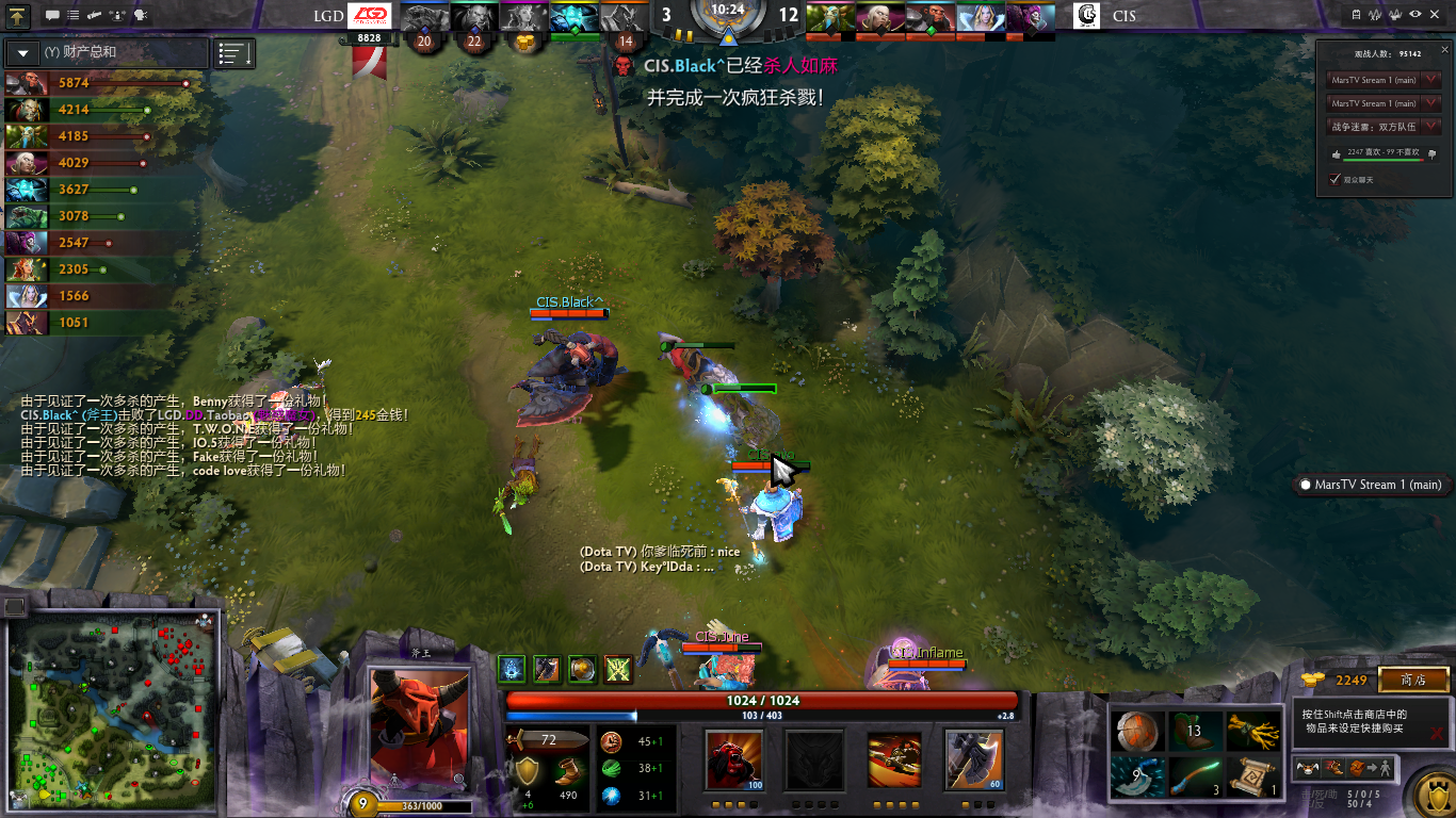 10分钟,CIS下路抱团推二塔,卡尔磁暴斧王跳吼导致潮汐没蓝放技能,随后CIS队员一路冲杀,小B神的斧王4连斩完成一次疯狂杀戮。