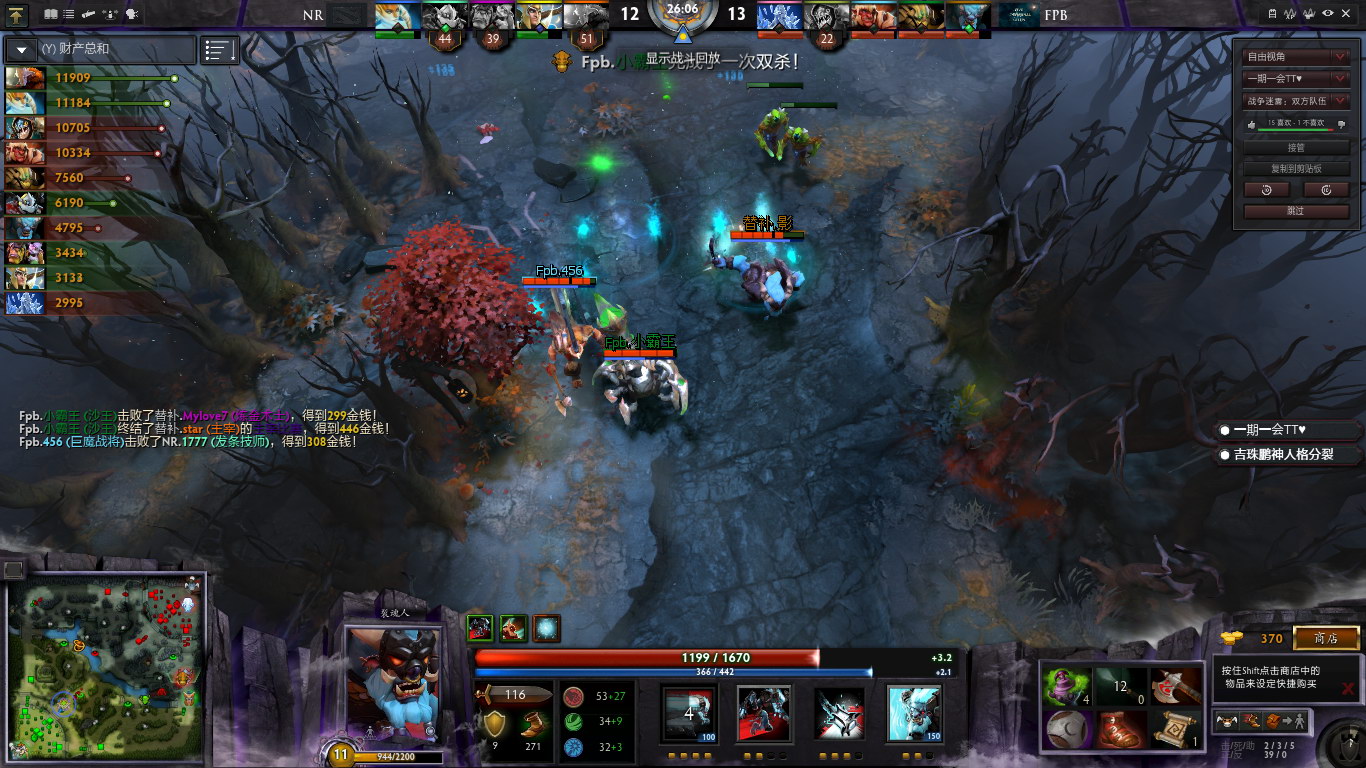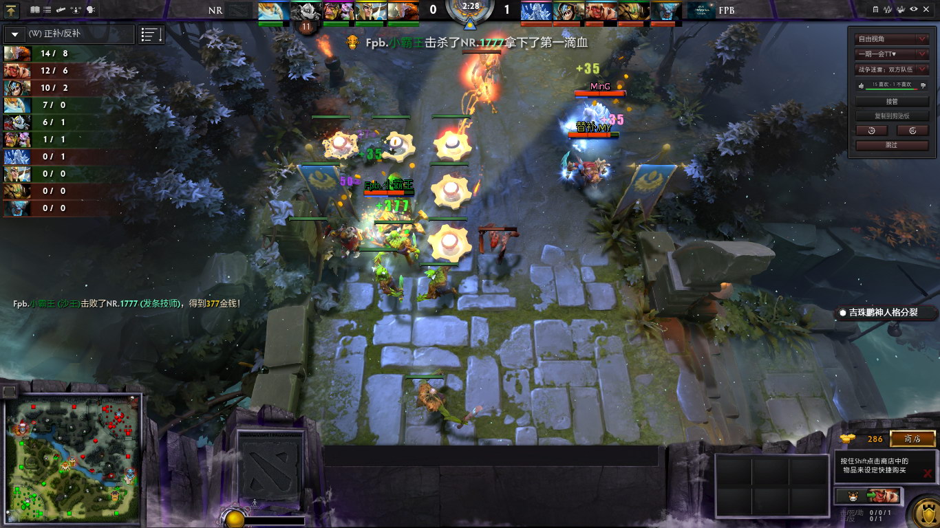 9分半,巨魔战将想单杀NAGA却被埋伏的发条技师击杀,NR全队集结,FPB集体残血不敢防守,NR推掉中路一塔。11分15秒,NR集结推掉上路二塔,FPB选择发育没有接团。推掉上一塔的NR进入野区,正好抓到了埋沙打野的沙王,剑圣无敌斩收下人头还击杀了一个大野怪,收获颇丰。