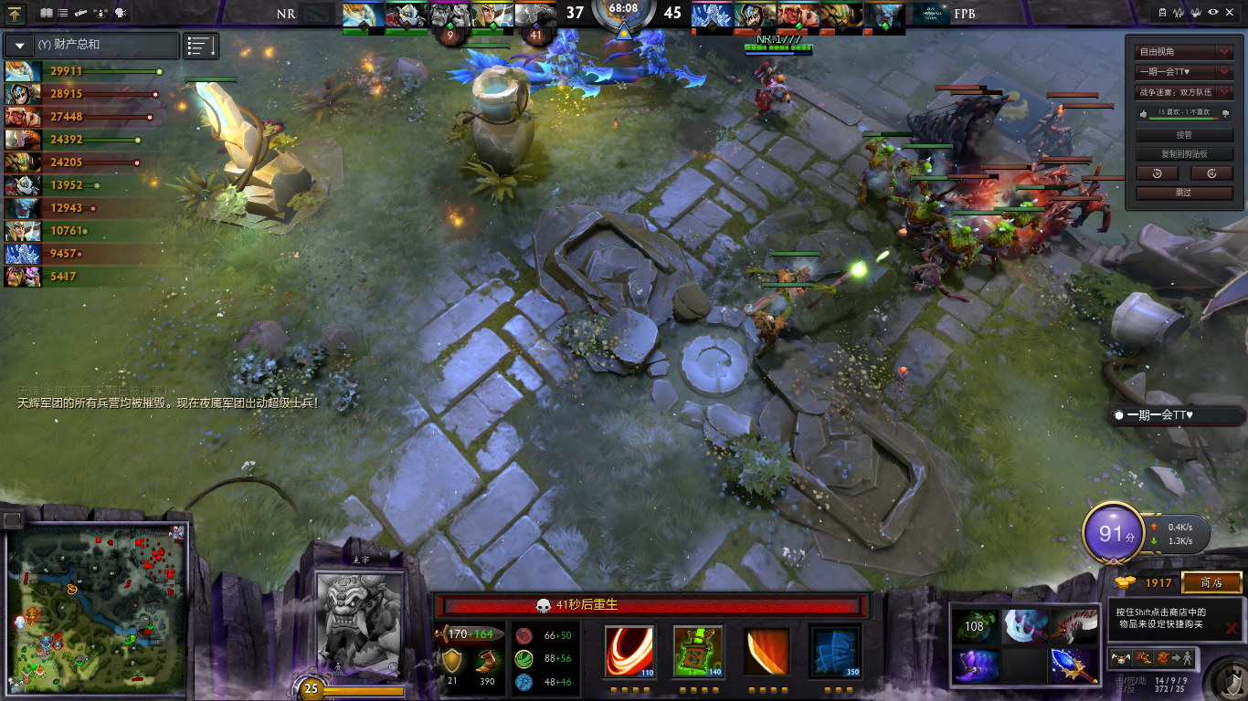 67分,FPB再度上高!NR的发条先手,天怒法师击杀了沙王,沙王随即买活。双方开始了冗长的交换和买活,最终,FPB破掉中上两路,召唤超级兵!