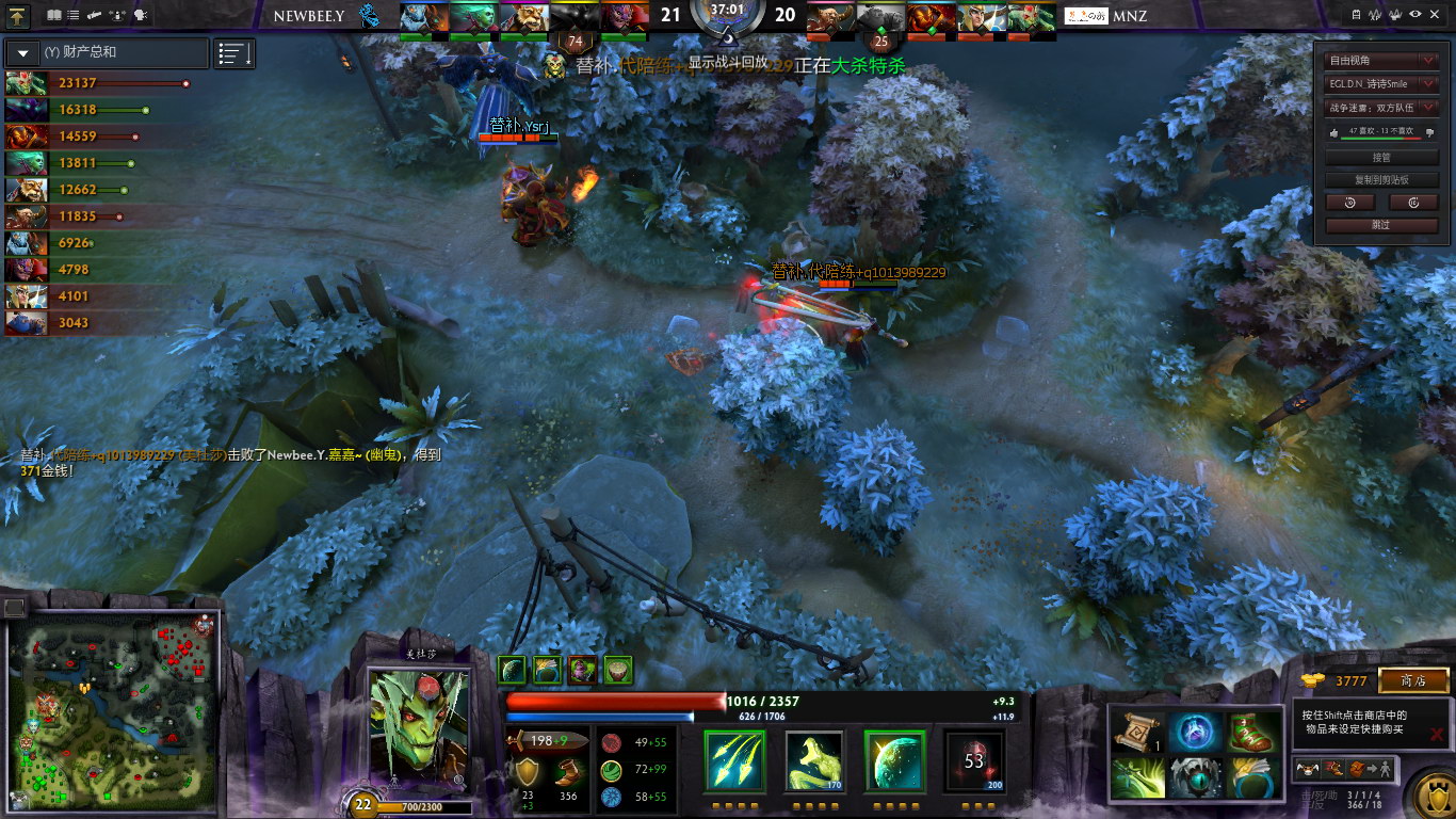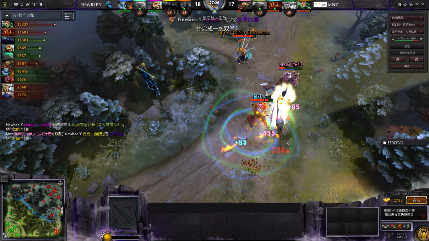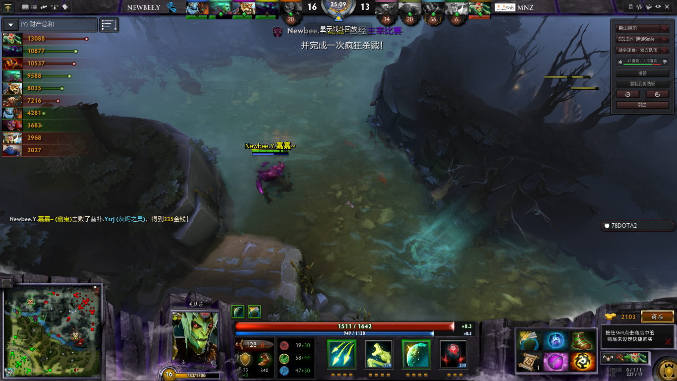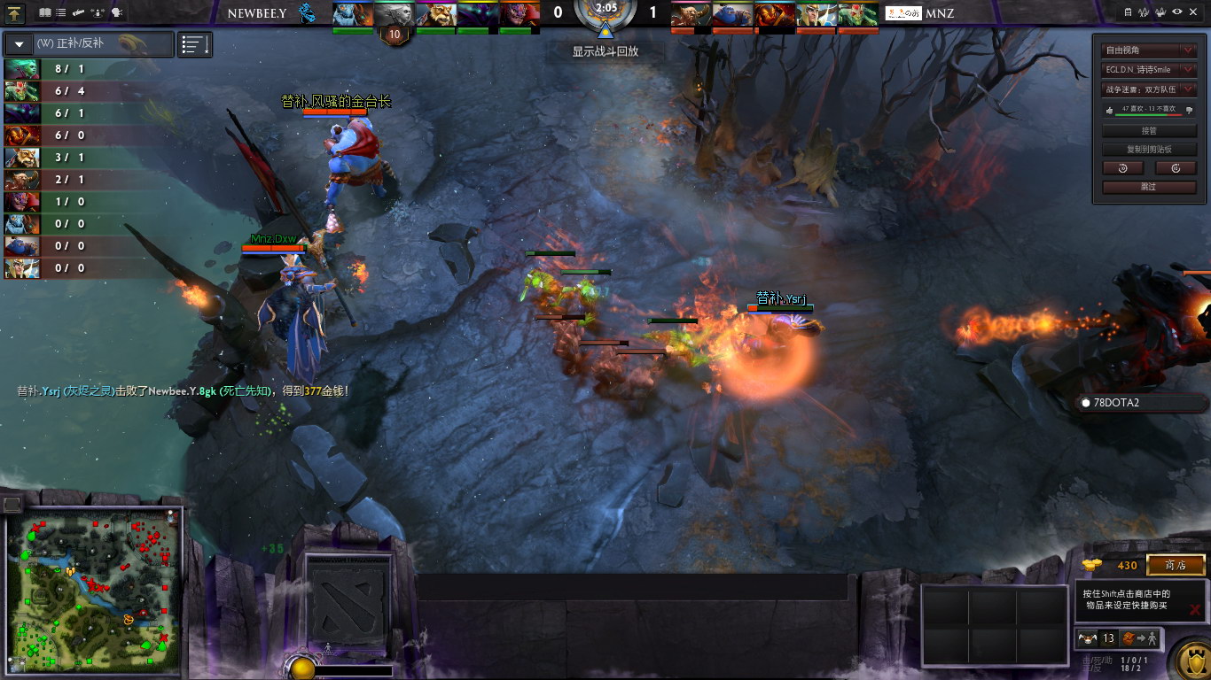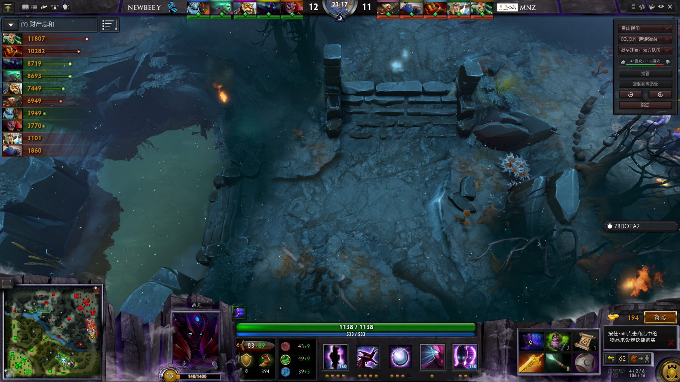 随着幽鬼等级提升,以及Mnz几波阵型分散,NB青训队逐渐找回来节奏,多次击杀Mnz的英雄。但是,始终无压力farm的火猫和美杜莎,成为了极大的隐患。幽鬼频繁参战,虽然收到人头,但是代价就是自己的经济始终不够好。