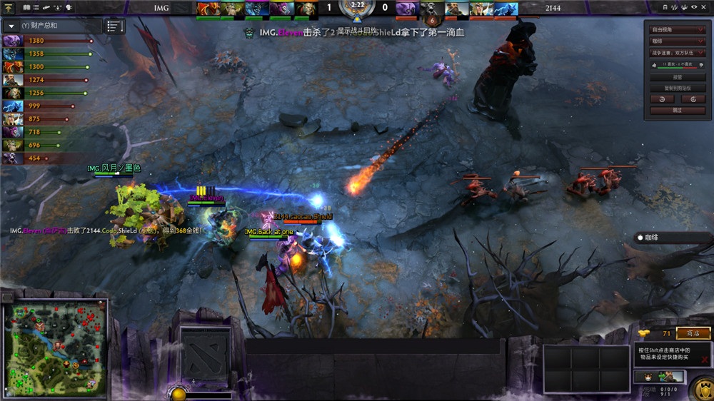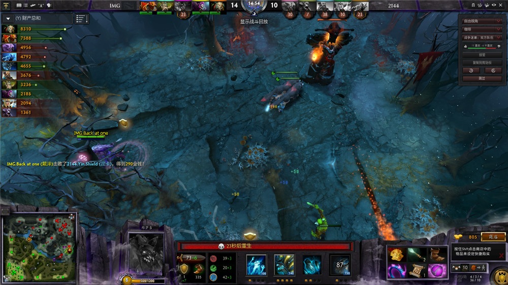 1分钟后,船长上路先手,大树走位不慎被大招大到,死灵飞龙和树精卫士阵亡。 11分钟,双方上路开团,2144先手龙骑士,但是技能衔接不够完美,龙骑士躲开了船长的大招!2144蜂拥而上击杀了暗影牧师,龙骑士也是残血,但是支援到的IMG众人留下了对面3人!顺路,拿下了2144的上路一塔。但是,随后一波,船长大招到位,双方也是强行有来有回。