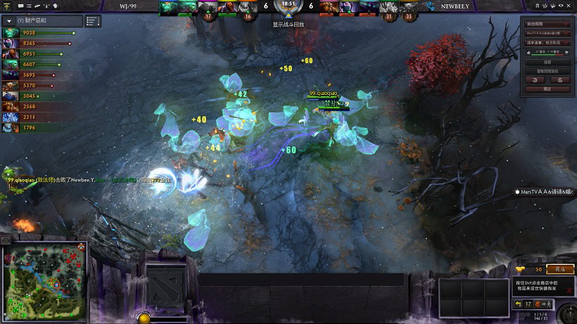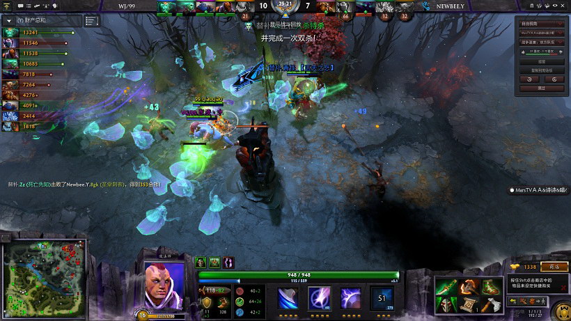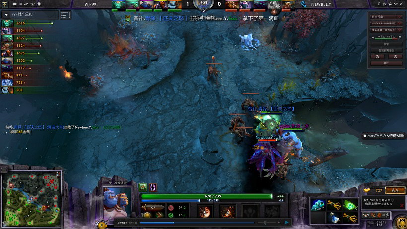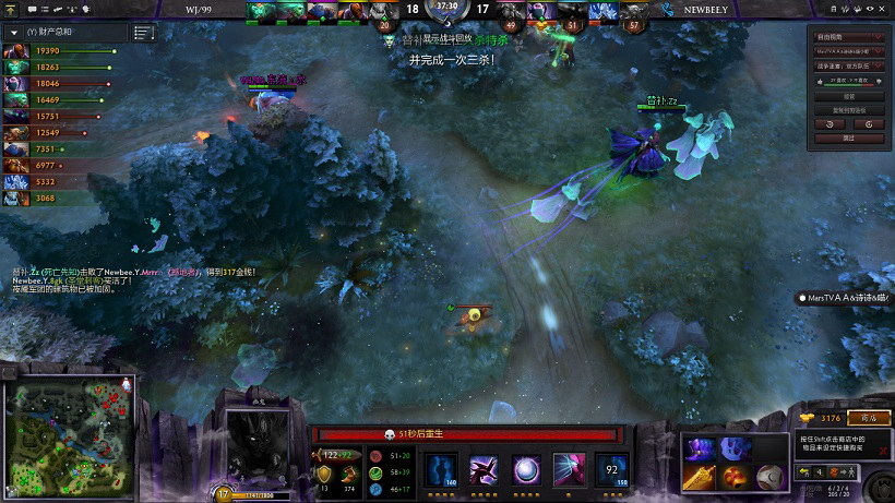 开局双方分路选择就很有针对性,敌法师和人马在上路展开solo,死亡先知和圣堂刺客在中路展开对决,下路双方则是各具特色的刚三组合。WJ99的分路还是占到了优势,敌法师面对人马丝毫不劣,中路则是55开的态势,而下路,幽鬼的弱势让自己方被双头龙和食人魔魔法师消耗的很严重。4分47秒,冥魂大帝先手冰魂,冰魂被杀交出一血。