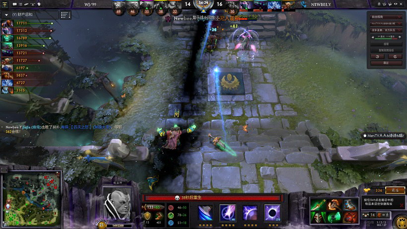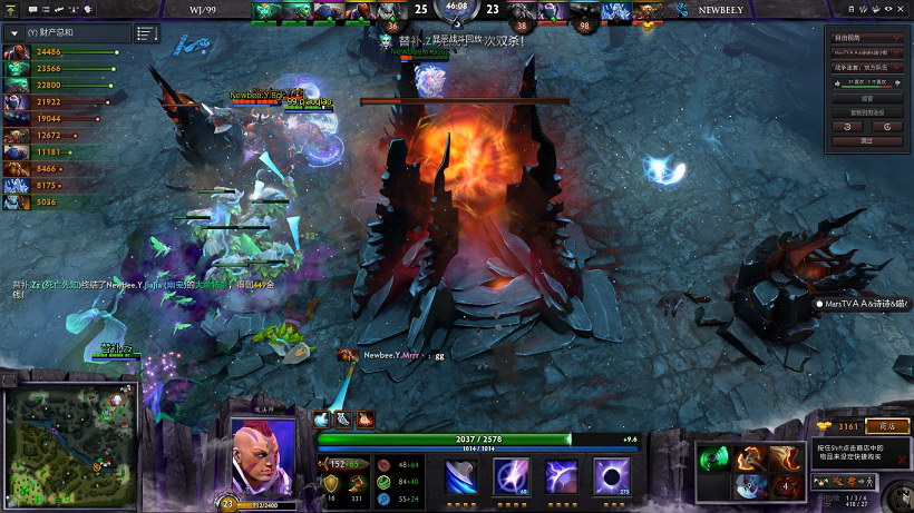 22分,双方在下路二塔处遭遇。圣堂刺客TP落地被控,直接被秒。随着二塔被破,双方经济差距拉大到6000.25分,双方在夜魇野区遭遇,转角相遇还是WJ99反应更快,人马冰魂被秒。圣堂刺客开启BKB切掉双头龙,但是自己也还是被WJ99众人冲塔击杀。