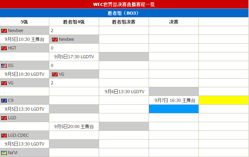 9月5日——7日,WEC2014 DOTA2世界总决赛由中国区5支战队(NewBee、VG、LGO、HGT、LGD.CDEC)、欧洲区2支战队(C9、Na'Vi)、美洲区1支战队(EG),一共八支战队角逐冠军荣耀和高达103万元人民币的总奖金,奖励现场发放!据赛事组委会介绍,为期三天的线下比赛将特邀浙江卫视主持人华少担任盛典司仪。8只顶级战队云集黄龙体育馆,为所有电竞爱好者奉上3天不间断地电竞盛宴。具体赛程安排如下: