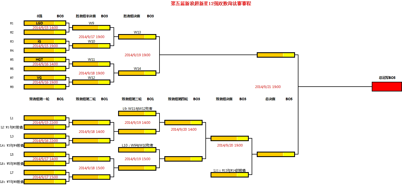 1、海选赛:8月29日-9月4日,单败淘汰赛,出线6支战队;