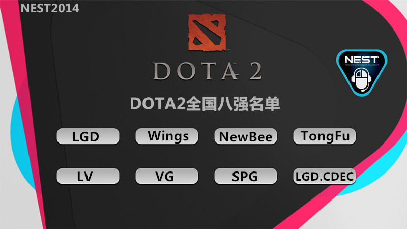 由国家体育总局体育信息中心主办NEST2014全国电子竞技大赛DOTA2项目经过2个月的预选赛选拔,全国八强名单最终在近日出炉。最终LGD,Wings,NewBee,TongFu,LV,VG,SPG,LGD.CDEC等八支战队将在月底齐聚江苏昆山,角逐最终的冠军。