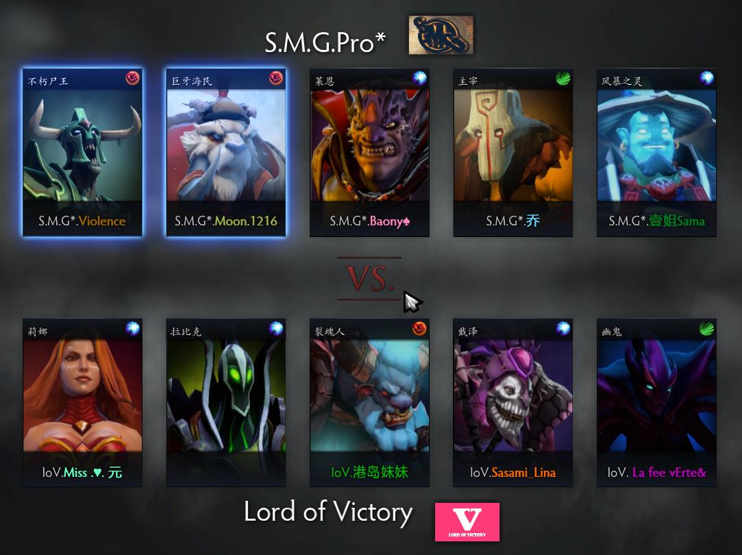双方阵容:SMG位于夜魇,选择了不朽尸王、巨牙海民、莱恩、主宰和风暴之灵,阵容偏重于GANK和中期;LoV则是选择莉娜、拉比克、裂魂人、戴泽和幽鬼,一套偏重于后期的阵容,力求前中期局势稳定,后期幽鬼解决比赛。双方的BP还是下了不少心思,也拿到了自己想要的阵容,不知道会擦出怎样的火花。