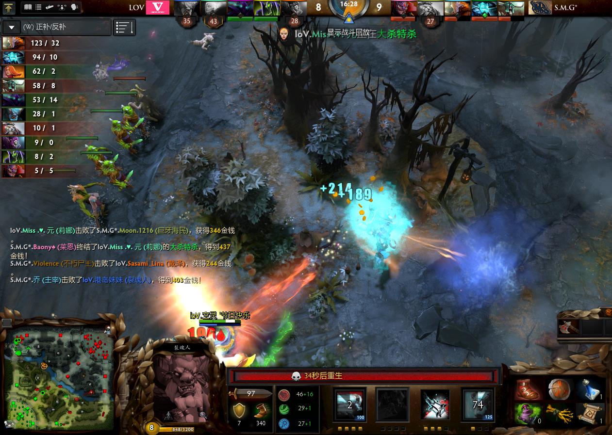 28分钟,SMG带盾推进中路二塔。主宰在万军中斩杀幽鬼,拉比克和莉娜换掉了巨牙海民和莱恩,SMG还是在莉娜买活后推掉中路二塔扬长而去。
