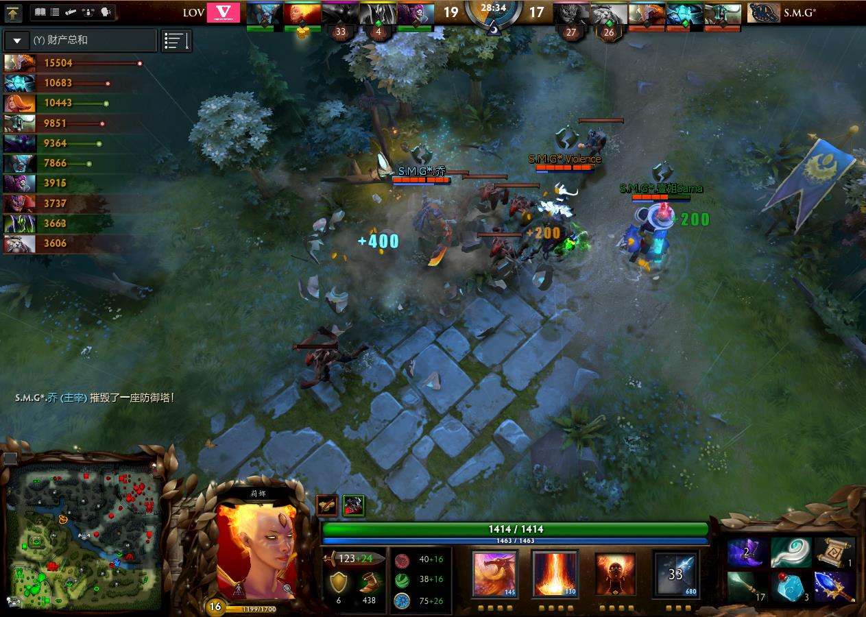 13分钟,SMG抱团推LoV中路一塔,但是LoV顽强防守,打出一波2换3,只是她们已经发现,手握狂战斧的主宰将是很大的麻烦。16分钟,LoV开雾试图击杀主宰,主宰直接魔免TP走人。LoV反推SMG上路一塔,SMG迅速集结,巨牙海民吸收无数伤害倒下,SMG还是打出一波1换3。