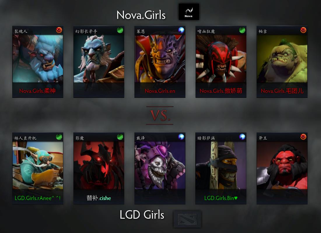 LGD女队选出了矮人直升机、影魔、戴泽、暗影萨满和斧王的阵容,组成相对合理和完善,Nova的阵容则是裂魂人、幻影长矛手、莱恩、嗜血狂魔和屠夫,相对奇葩却也有着不错的输出能力。