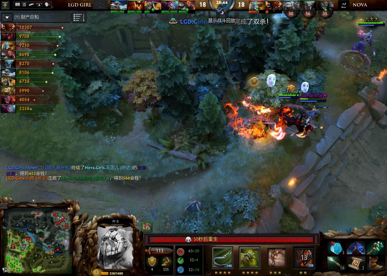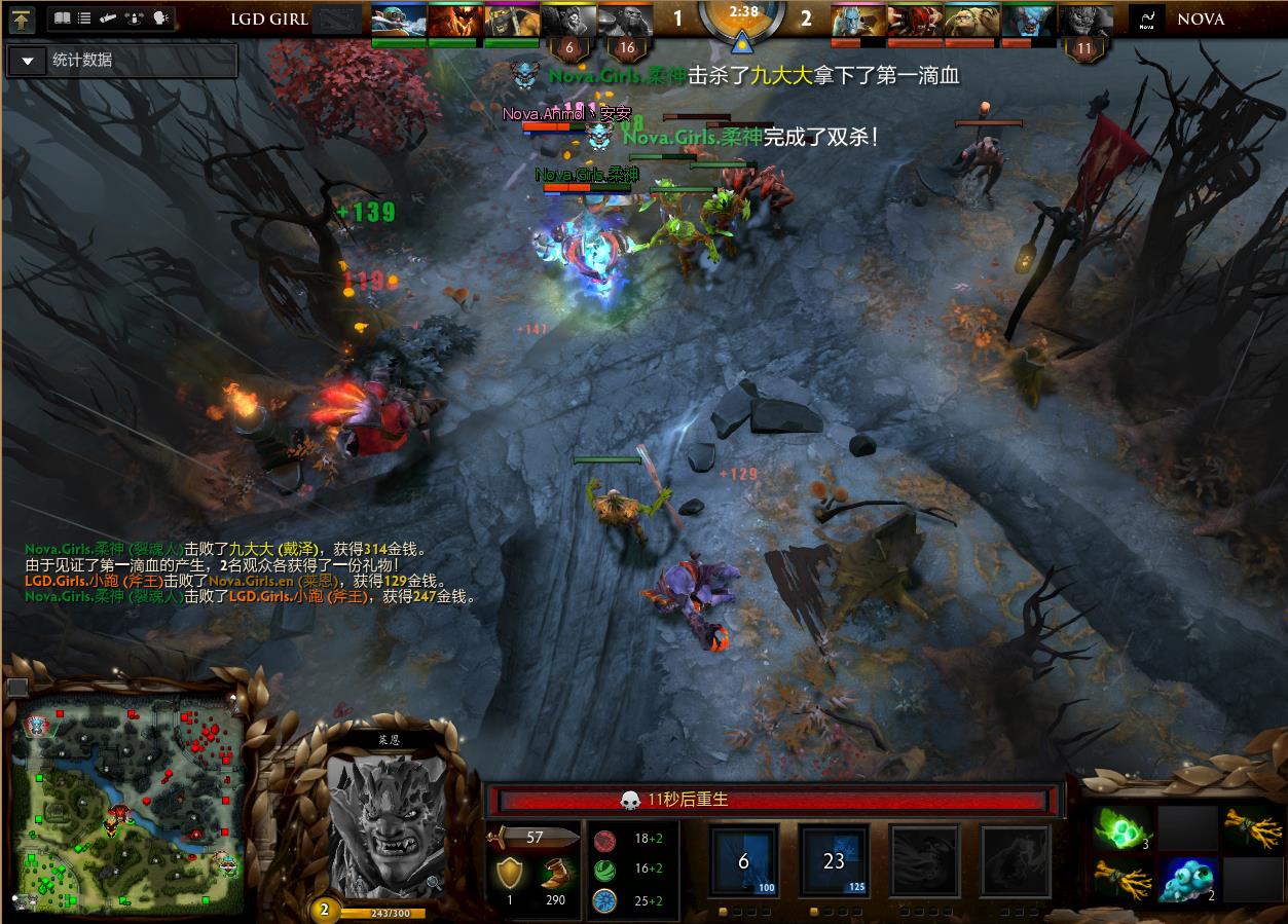 10分钟,双方在上路展开团战。裂魂人先手被击杀后买活,但还是无力打败LGD女队强大的AOE,再次死亡,被打出0换4.但是随后在中路,LGD女队一波走位失误被抓住,Nova的一波1换2也是找回了自信。随后,Nova的屠夫屡建奇功,连续先手让LGD单人被击杀,多路带线也是有了成效,经济完成反超!