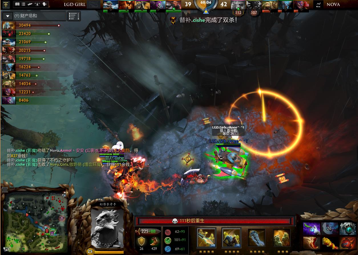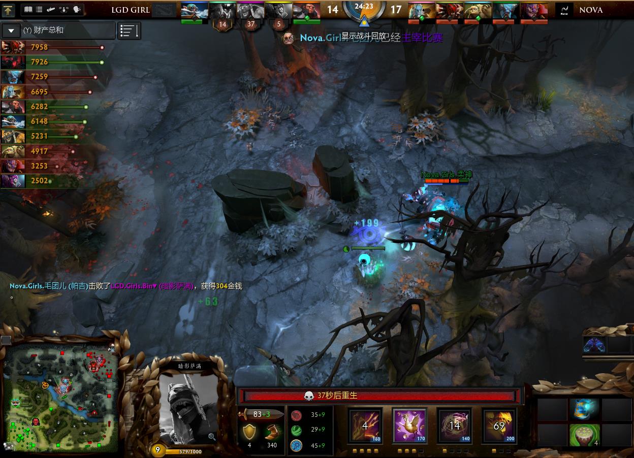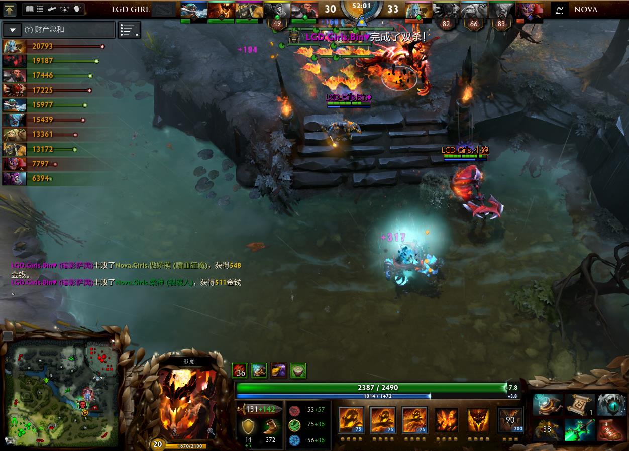 之后,双方打出互相带线换塔的打法。28分钟,Nova先手影魔,但是影魔开出黑皇杖完美大招,Nova被瞬间打残。随着这一波1换3,LGD女队似乎找到了应对的办法。随后,LGD女队又在中路河道击杀3人,一点点打回了前期的劣势!