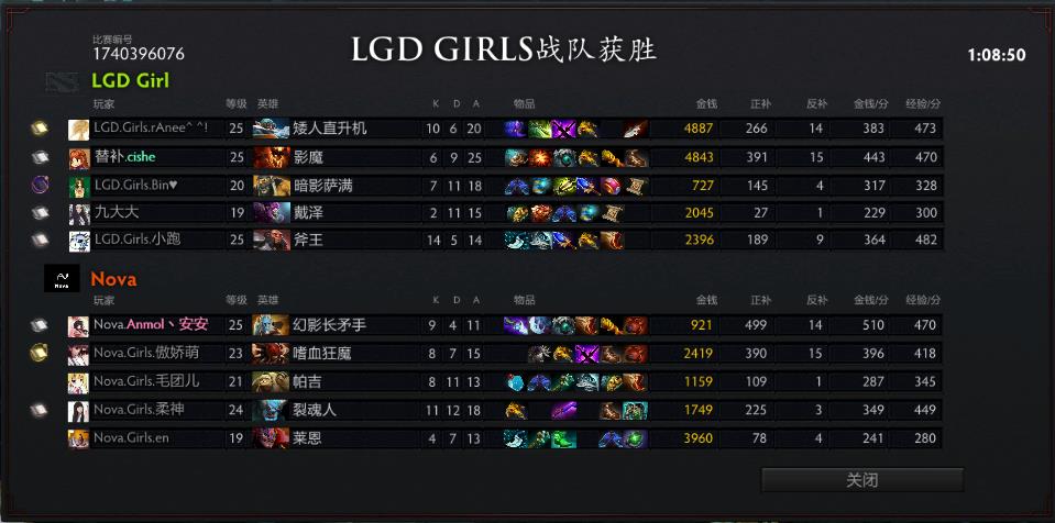 总评:LGD女队在中期被压制的情况下,合理牵制分割战场,拖到影魔的装备成型后打出正面配合,成功翻盘。而Nova的阵容在中期发挥出色,但是后期有几次关键失误,沟通和经验略显不足,也没能把握到几次关键的时间点。这也是她们需要总结的,如此的实力,之后的表现想必会更加出色。