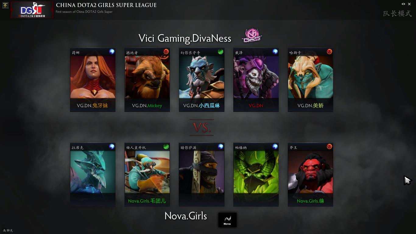 Nova在BAN人阶段大胆放出拉席克和矮人直升机,自己轻松拿到,形成了拉席克、矮人直升机、暗影萨满、帕格纳和斧王的强势推进阵容。而VGDN则是选择了莉娜、撼地者、幻影长矛手、戴泽和哈斯卡,略有模仿Mulan上场阵容的痕迹。令人意外的是,莉娜走了中单,哈斯卡劣势路补刀,也是放弃了阵容的强势。