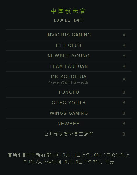每个地区均为十支队伍分成两组进行循环赛。每组排名前二的队伍将晋级至下一轮双败淘汰制的比赛中。每个地区的第一名和第二名将直接受邀参加法兰克福特锦赛。中国区预选赛将在10月11日上午10:00时开启,届时所有的比赛可在客户端内进行免费观看,切勿错过自己喜欢的比赛。