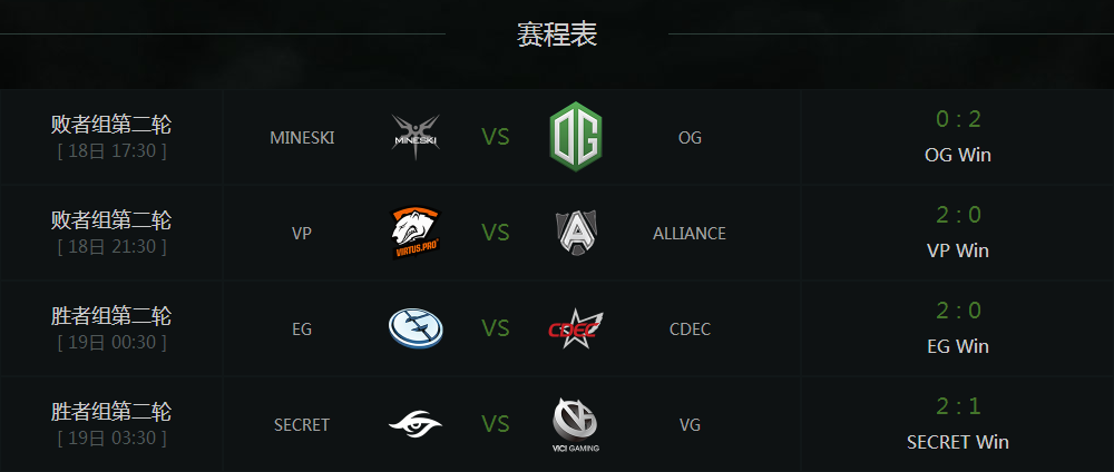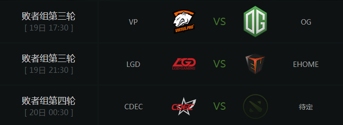 19日的所有比赛都将在败者组中展开,又将会有三支战队离开本届法兰克福特锦赛赛场。第一场VP对阵OG,他们之间的胜者将在第三场与CDEC进行比拼。