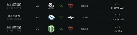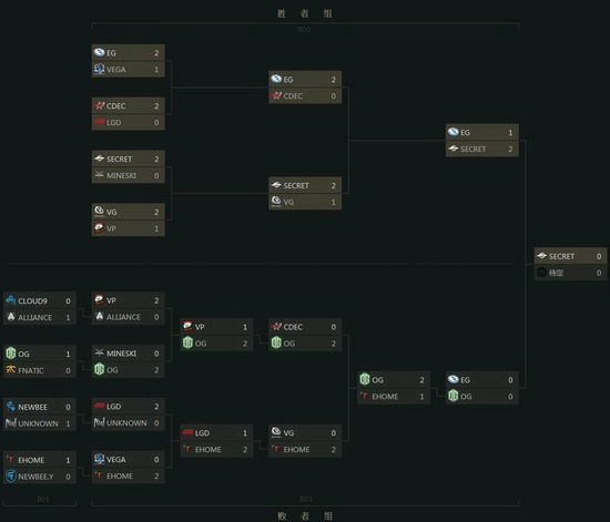 中国军团的内战向来是牵动人心的,败者组中EHOME以2:0击败了VG,VG战队则离开了本次比赛舞台。胜者组决赛中SECRET与 EG经过3局精彩的比拼,最终由SECRET战队获得比赛胜利。在最后EHOME与OG的比赛中,最后一支中国战队EHOME以1:2不敌对方,至此所有中国战队都遗憾出局。