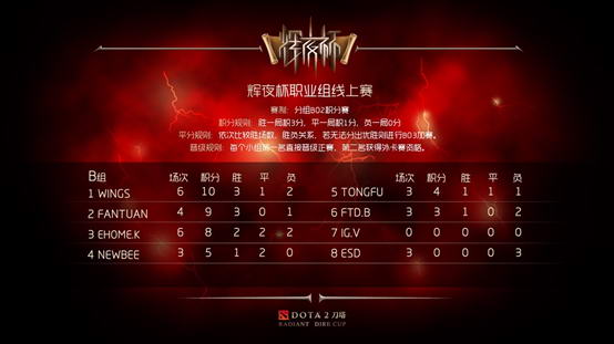 相对于A组,B组出线形势稍显扑朔迷离,WINGS战队3胜1平2负积10分暂时领跑B组,FANTUAN则以3胜1负积9分的战绩紧随其后,其他战队都存在出线机会。而B组中的NEWBEE仅1胜2负积5位列B组第4。而在之后的比赛中,NEWBEE将迎来TONGFU、iG.V、FANTUAN和FTD.B的轮番挑战。而iG.V今天将在辉夜杯的舞台上迎来他们的首战,相信许多玩家还是十分期待他们的表现。