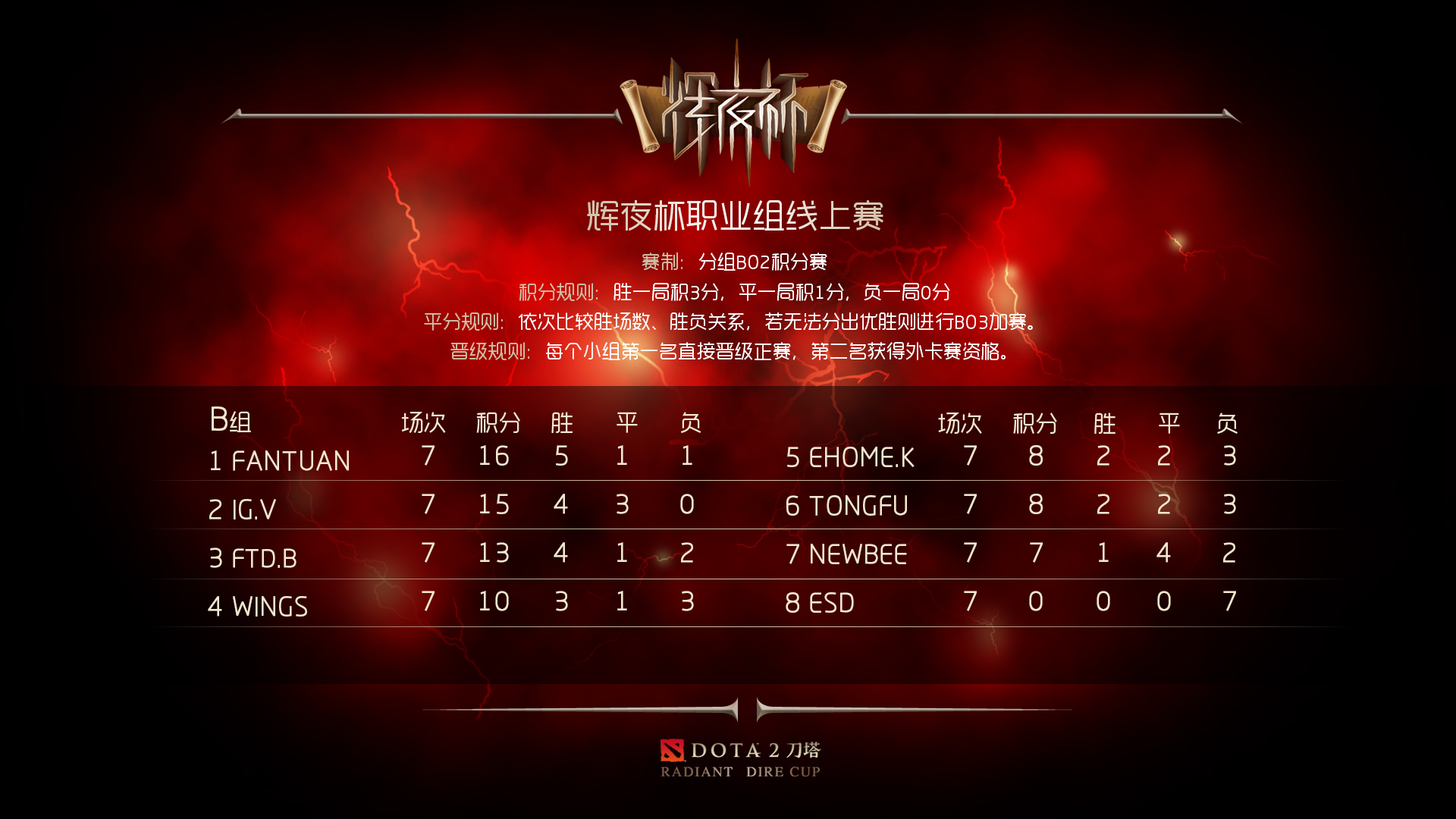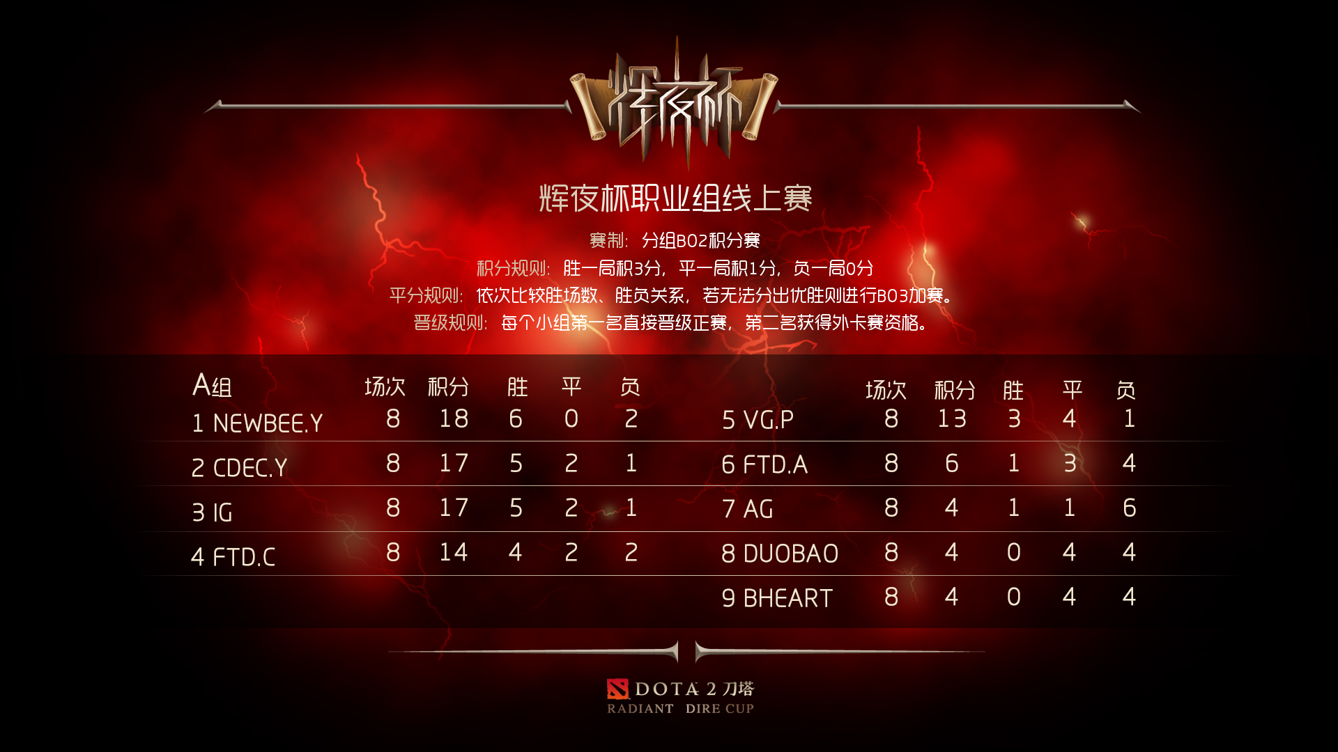 由完美世界主办,ImbaTV承办的大型赛事辉夜杯职业组预选赛已经全部结束!最终NEWBEE.Y和FANTUAN分别取得A、B两组头名,直接晋级辉夜杯主赛事。而获得A组第二的CDEC.Y与B组第二的iG.V将进入外卡赛,与两支从391支报名辉夜杯职业选拔赛的战队中脱颖而出的TRG、Insane Buster共同争夺最后2个晋级主赛事的名额。