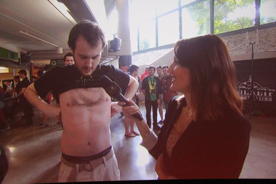 在播放现场观众采访期间,一位“胸毛哥”成功抢镜,在主持人直播的同时,“胸毛哥”默默的来到主持人身后并且亮出休整成DOTA2 LOGO的胸毛,这也引得全场观众爆笑不止。