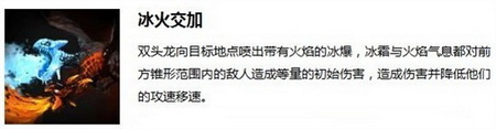 冰火交加为魔法伤害,先后喷出寒冰和火炎,寒冰吐息可以减速敌人,火焰吐息则对敌人造成持续伤害。前端范围:200,末端范围:250,燃烧伤害:5/10/15/20/,移动速度减缓30%,持续时间:4,伤害35/70/105/140/,冷却:10秒,耗蓝:135/140/155/170。