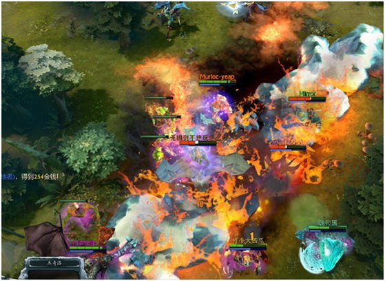 非常霸气的技能,aoe输出相当高,范围大,cd时间短。虽然耗魔多,但是双头龙的魔法量很高,还是没关系的。缺点就是施法有延迟,而且对手不会站在一堆等着你去放大,也不会站在你的大招上变成烧猪,这就需要技能的运用和与队友的配合!配合上队友的各种控可以果断烧烤对方,还有就是双头龙最著名的3连。当你的队友成功的帮你控制住对手后,你就可以果断出击了,首先一个大,迅速接冰封路径,冰封路径的半径虽然没有万火焚身大,但是也是很宽的,两个技能范围大部分是重叠的。这时对手会被控在你大招的范围内,再加上个冰火交加,外加减速效果,这时追着A妥妥的收割节奏。当然,这3连不适合主动先手,除了小兵没有人会站着等你的施法延迟。技巧是关键,比如打一波漂亮的反手什么时候对手走直线呢?当你的队友被对面追杀落荒而逃的时候,果断TP过去,一个3连,这时对面头脑一热追着红血的很容易就被你的3连击中了,再配合其他支援队友反杀如图: