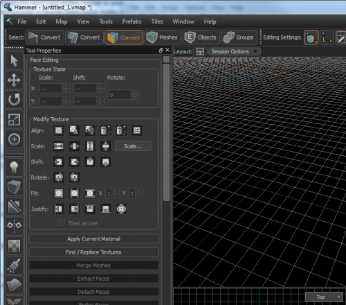 左边的工具栏包含了基本的工具模组,这和Hammer之前的版本差不多。选择工具有多重模式可以使用,也可以使用Spacebar在这几种模式中切换。 也可以用下列快捷键直接进入对应模式中: